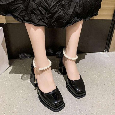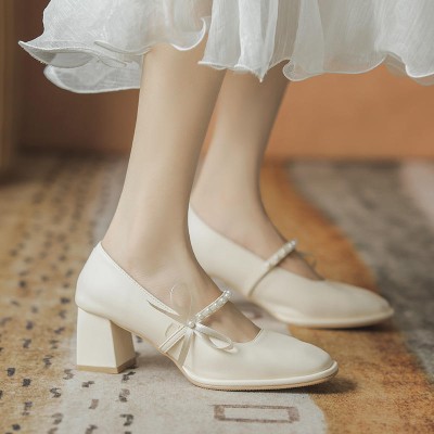 Summer Square Head Bow Mary Jane Shoes Women Mid Heel Retro Pearl Single Shoes Ladies High Heels