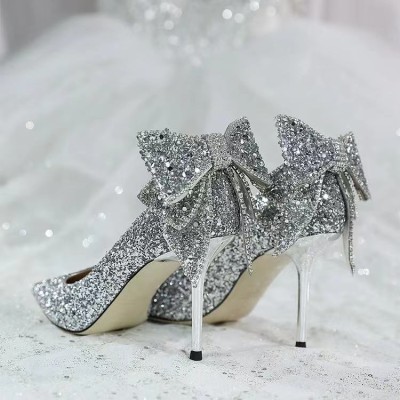 New Pointed Silver Crystal Sequins Sexy Wedding Bridesmaid Dress Shoes Bridal Princess Crystal High Heels