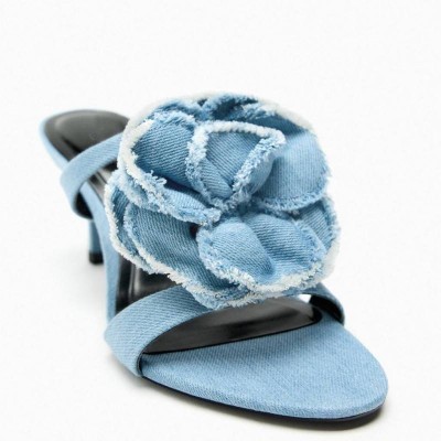 Hot selling fashion women's shoes blue denim fabric flower decoration sandals party wear low open toe heel for women and ladies